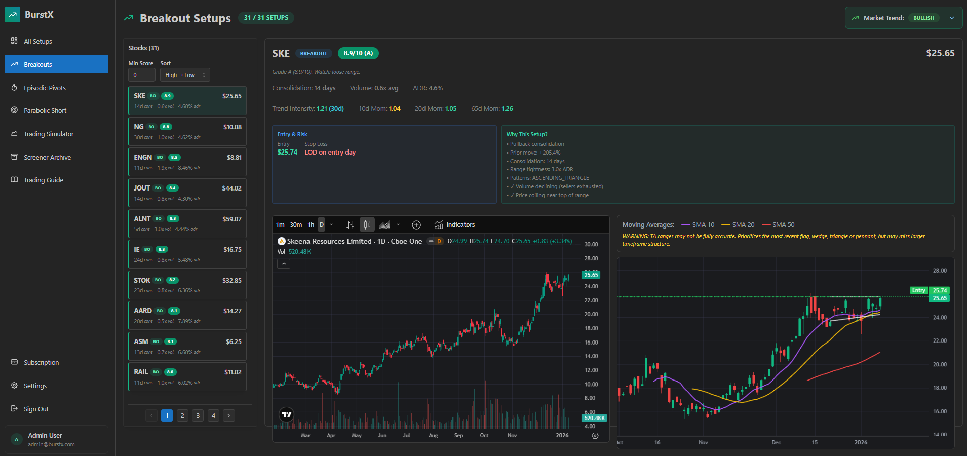 Clean, actionable views of every setup with integrated TradingView charts and all the details you need.